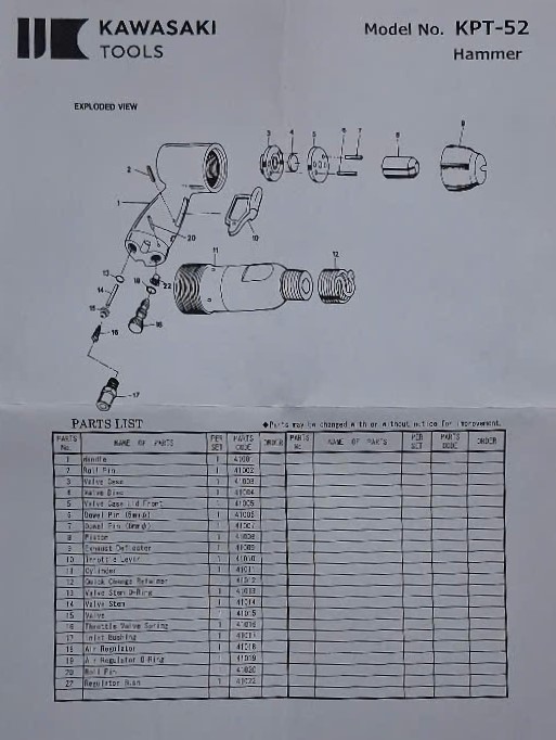 - Mã sản phẩm: KPT-52. Tốc độ đập 3.000 lần/phút, lượng khí tiêu thụ 6.74 L/S, áp suất làm việc 6.3 Bar, trọng lượng 1.65Kg.