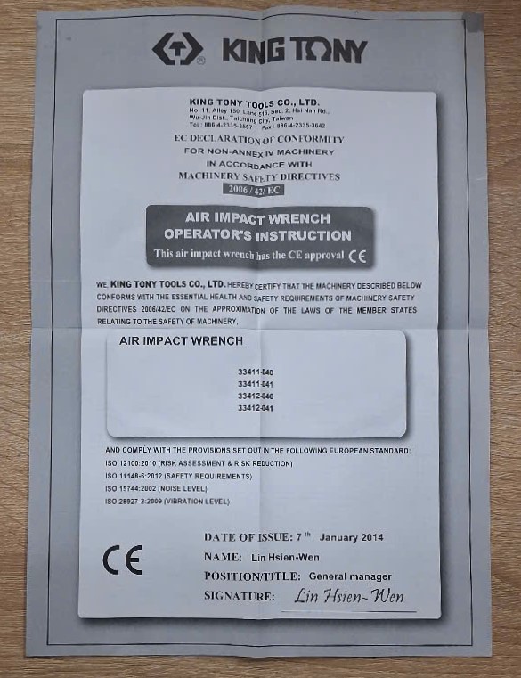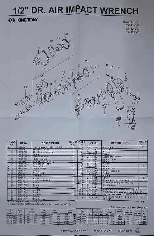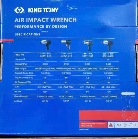 - Mã sản phẩm: 33411-040. Đầu nối tuýp 1/2 Inch, tốc độ không tải tối đa 8.000 vòng/phút, áp suất làm việc 90 psi (6.2 Kg/cm2), trọng lượng máy 2.6Kg.